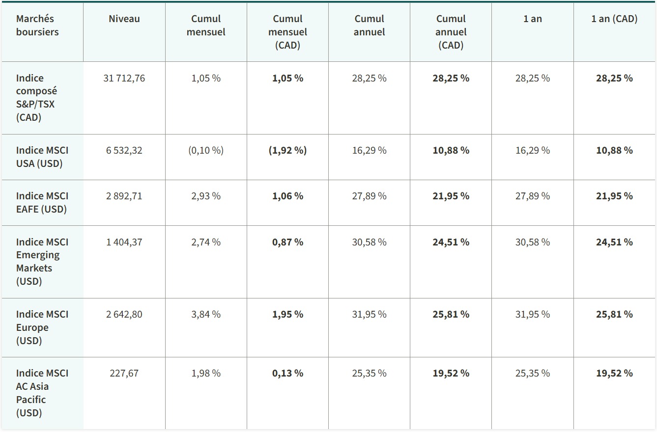 Rendements des marchés - au 31 décembre 2025