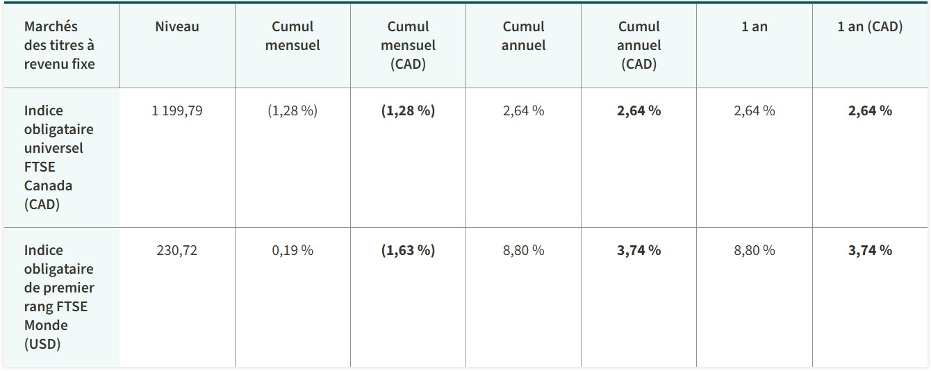 L’indice composé S&P/TSX a été entraîné à la hausse par le secteur des services financiers. Les actions états-uniennes ont un peu baissé. Les rendements des obligations gouvernementales à 10 ans du Canada et des États-Unis ont augmenté. Le prix du pétrole a reculé, celui de l’or a monté.