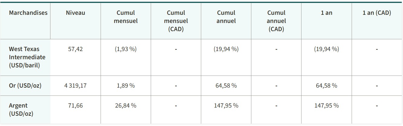 Certains produits phares ont atteint des prix records en décembre, car les tensions géopolitiques et les projections en matière d’offre et de demande les ont fait monter. Parlons d’abord de l’or qui a poursuivi son ascension amorcée en 2025. Les conflits géopolitiques incessants, jumelés aux inquiétudes soulevées par l’économie mondiale, ont poussé les investisseurs vers cette valeur sûre. De plus, l’éventualité que la Fed réduise les taux d’intérêt, peut-être à maintes reprises, en 2026, a fait bondir la demande pour le métal précieux. En 2025, la hausse du prix de l’or a été bénéfique pour le secteur des matériaux qui s’est hissé au premier rang de l’indice composé S&P/TSX. De leur côté, l’argent et le cuivre ont aussi atteint des sommets inégalés en décembre, entraînés par la rareté appréhendée de la demande. Ainsi, la demande en cuivre a explosé lorsque les acheteurs ont voulu devancer les tarifs que le président Trump avait menacé de lui imposer. Cela ne s’est pas fait étant donné l’importance du cuivre dans l’industrie manufacturière. Par ailleurs, le prix du pétrole a baissé en décembre. Les craintes ayant trait à l’offre ont été alimentées par le conflit opposant les États-Unis au Vénézuéla. Toutefois, l’Organisation des pays exportateurs de pétrole a jeté de l’eau sur le feu en annonçant qu’elle allait interrompre l’augmentation de sa production au cours des prochains mois.