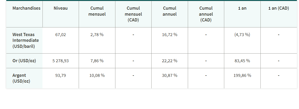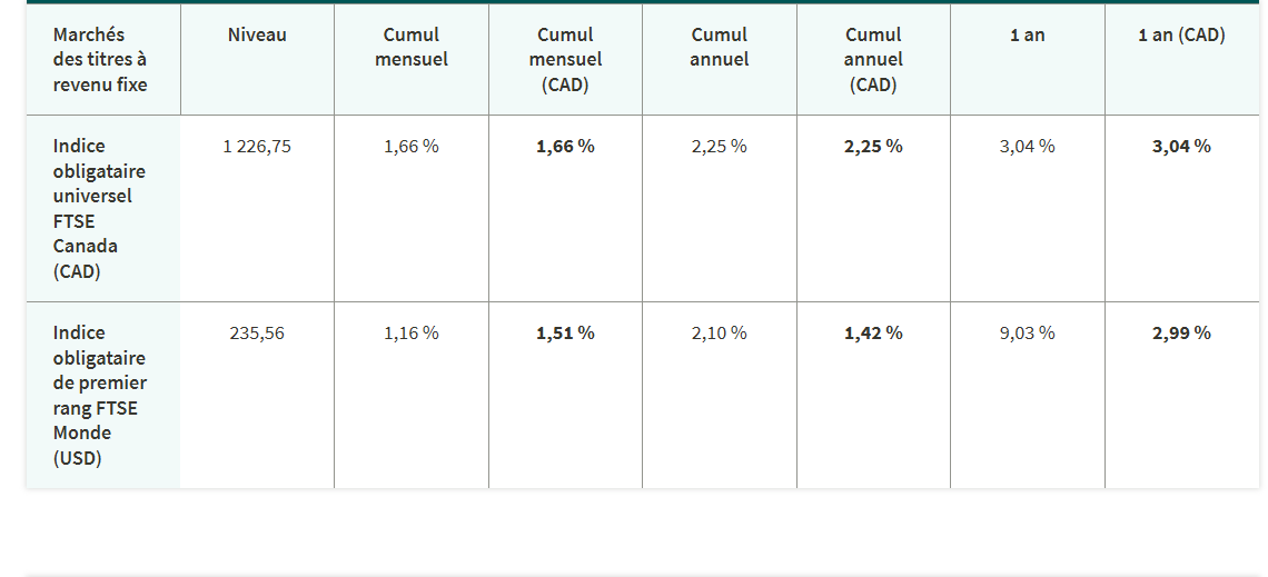 L’indice composé S&P/TSX a dégagé des gains considérables ce mois-ci, au point même d’atteindre des sommets inégalés. Les actions états-uniennes ont un peu baissé. Les rendements des obligations gouvernementales à 10 ans du Canada et des États-Unis ont reculé. Le prix du pétrole a monté, tout comme celui de l’or.